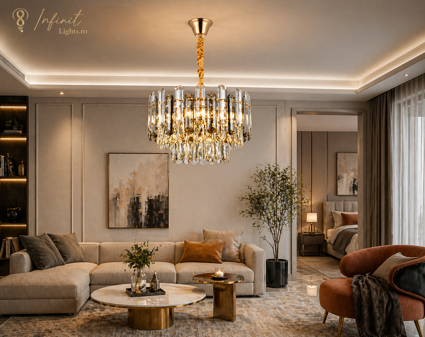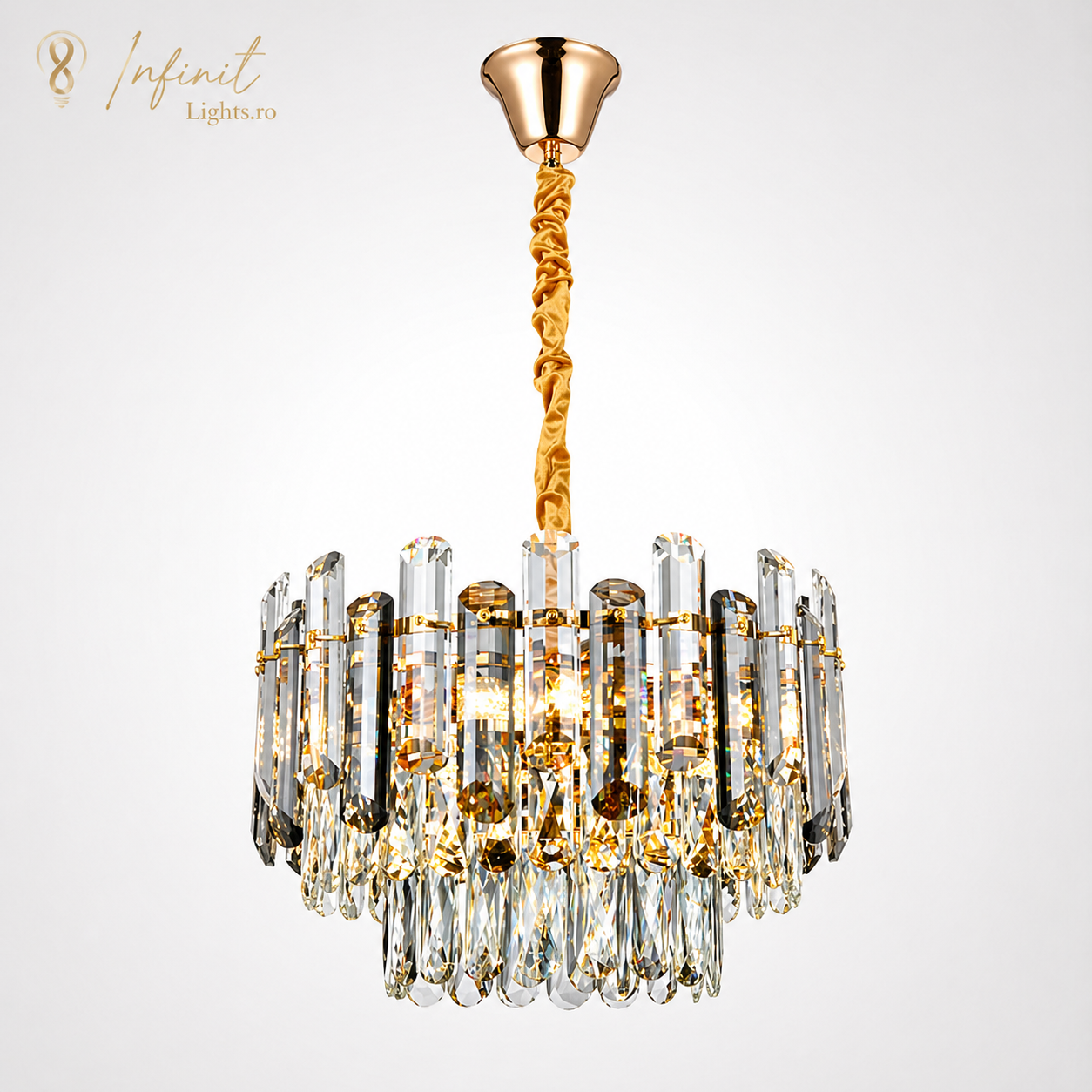 Această lustră din cristal k9 aurie de 50cm este o alegere potrivită pentru orice locuință modernă. Se potrivește foarte bine în living sau dormitor și oferă o lumină plăcută și caldă.