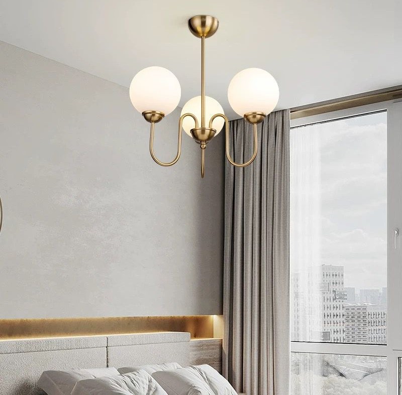 Această lustră elegantă cu trei brațe reprezintă un element de iluminat modern, perfect adaptat unui dormitor contemporan sau unei camere de zi rafinate. Realizată din metal cu finisaj auriu mat și dotată cu globuri sferice din sticlă opal, lampa oferă o lumină caldă și difuză, ideală pentru crearea unei atmosfere relaxante și intime.                                                                                                                                                                              Aceasta lustra functioneaza cu becuri G9(neincluse)! Nu contine telecomanda!